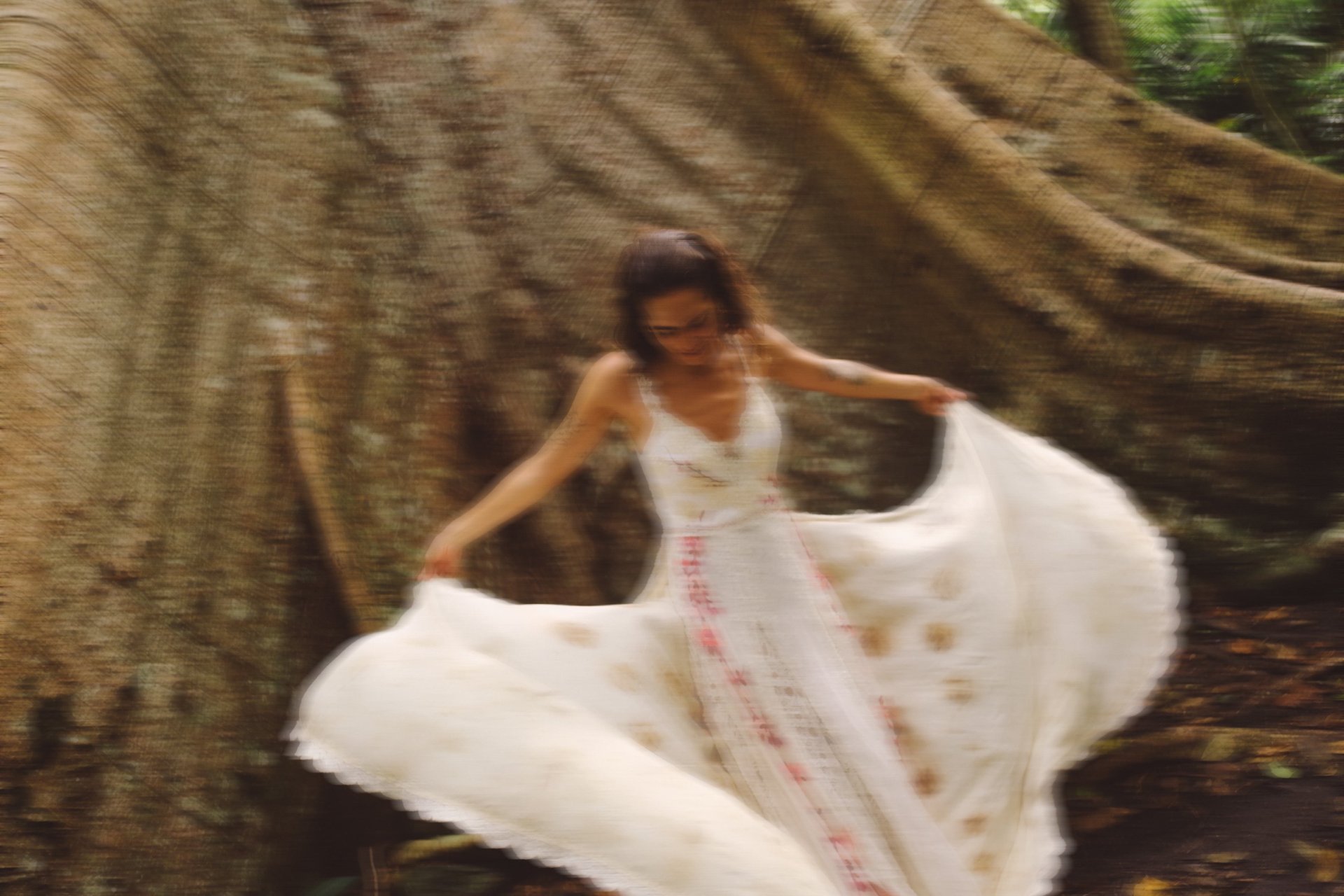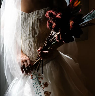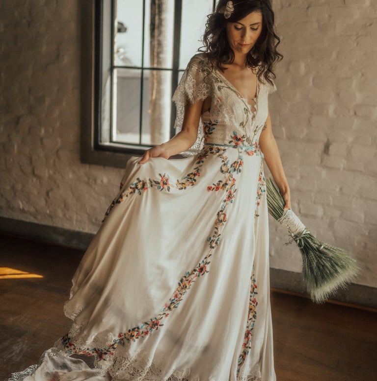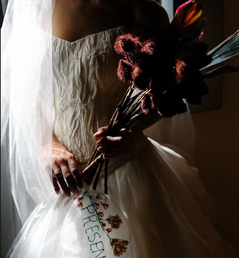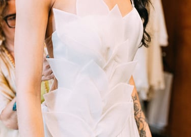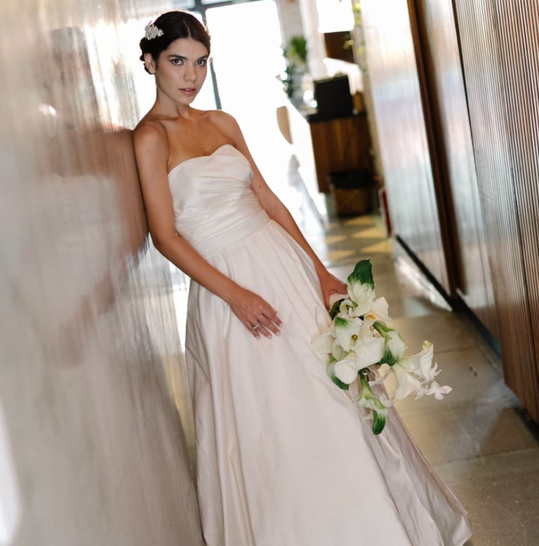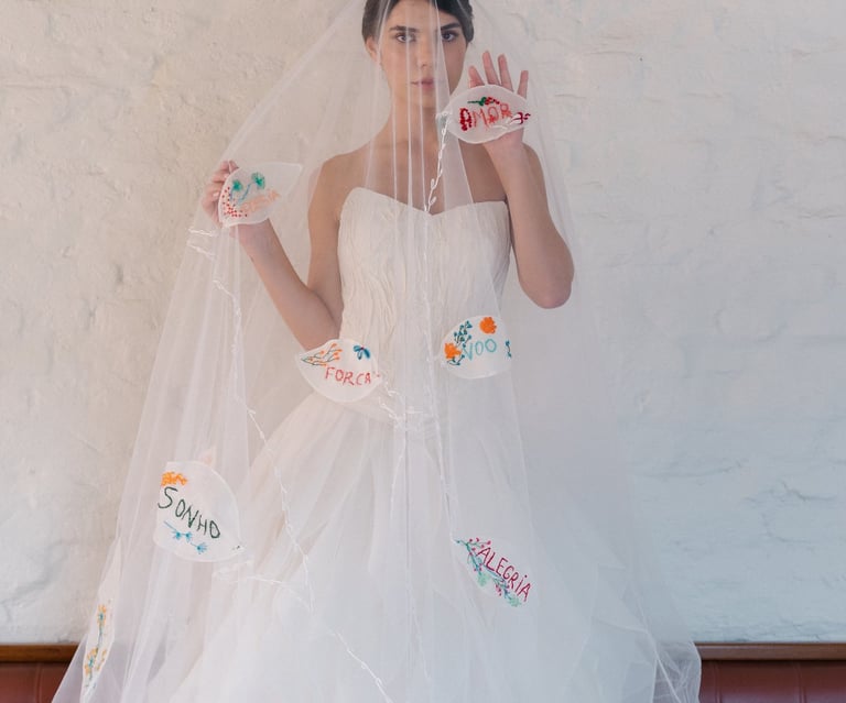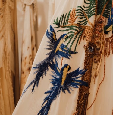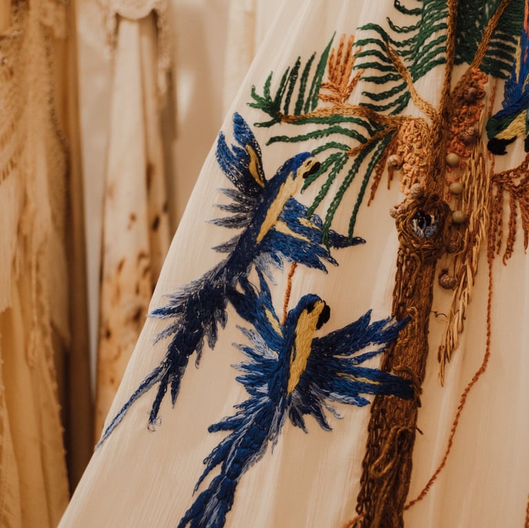 Vestidos de noiva criados a partir da natureza, da arte e da ancestralidade. Cada peça nasce do encontro entre seda, plantas e história.
