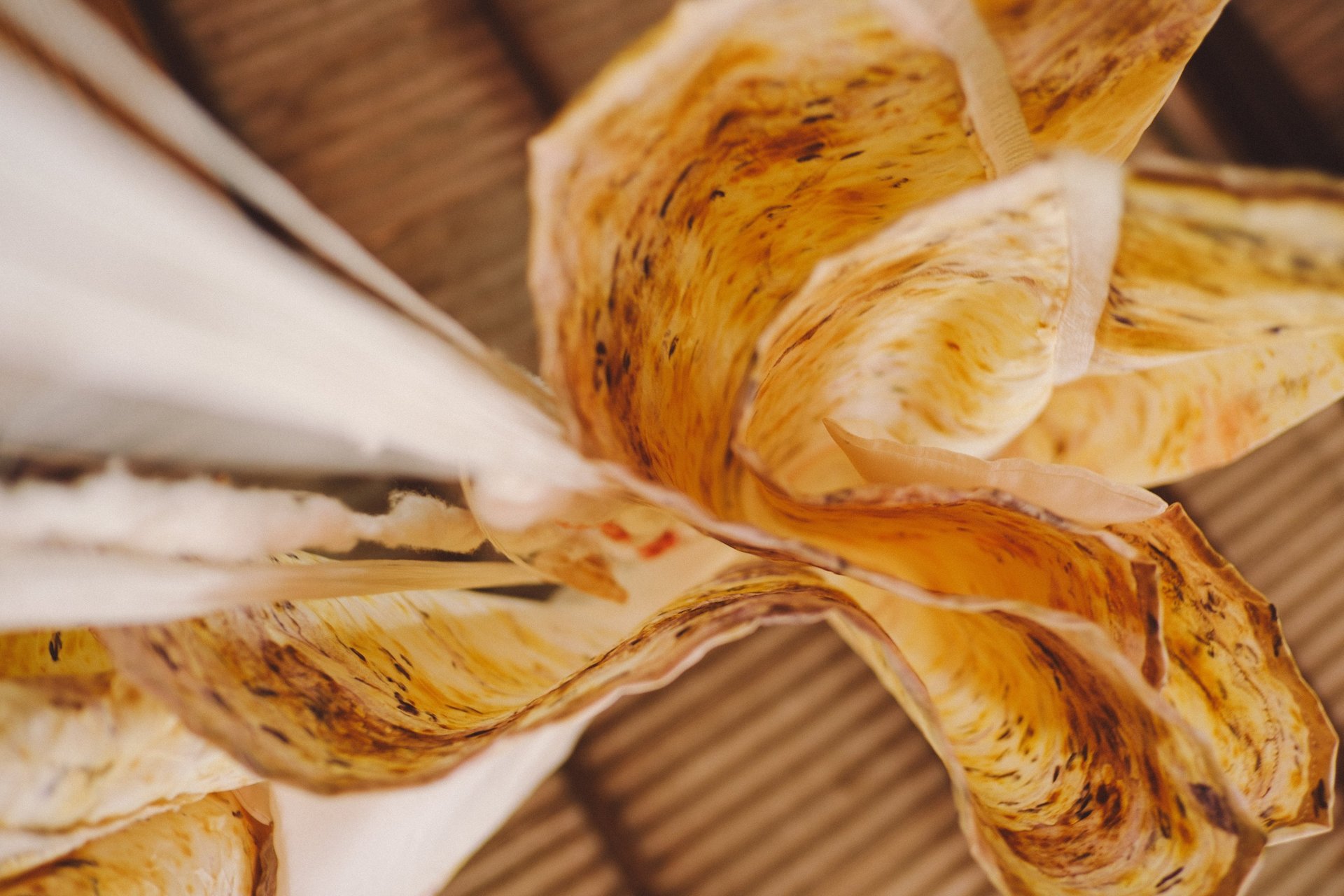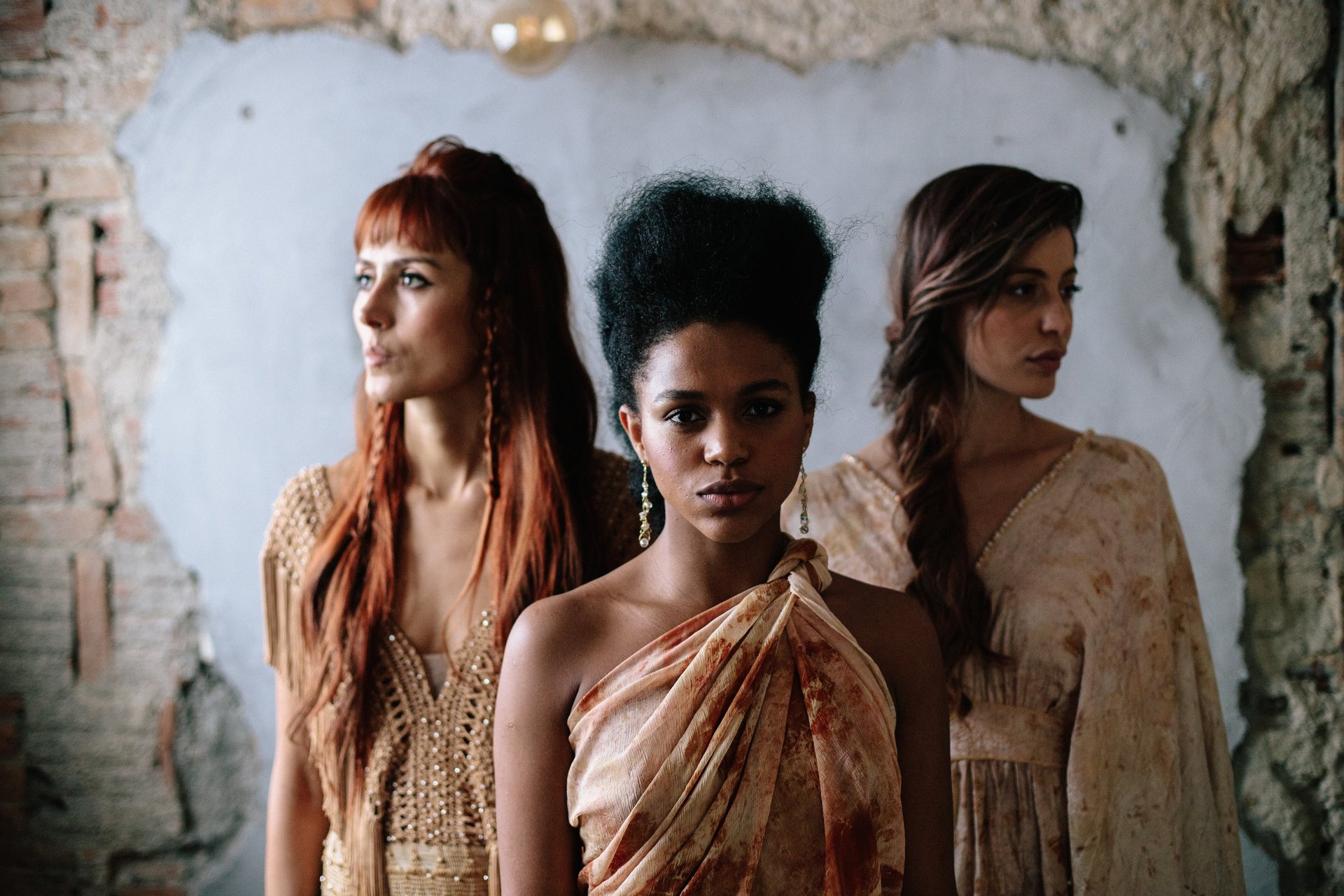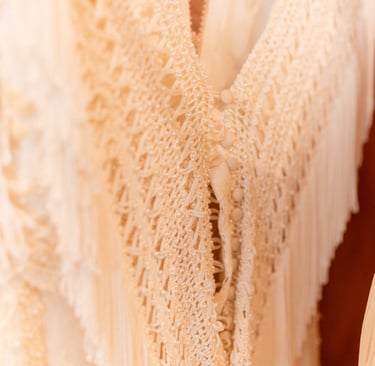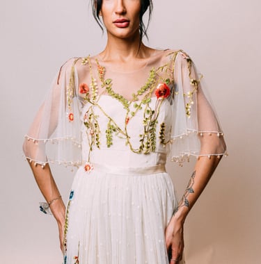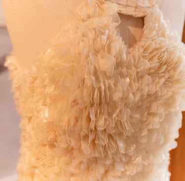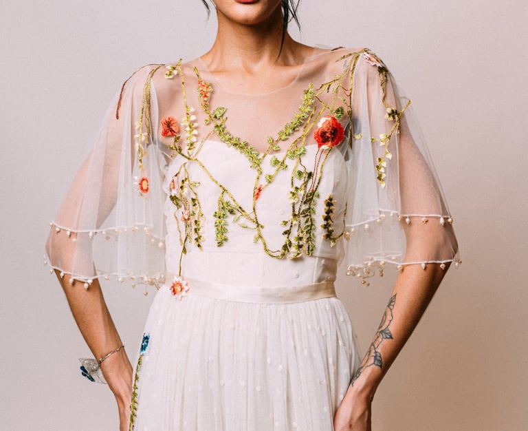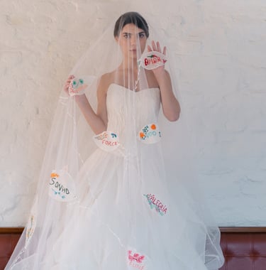 Vestidos de noiva criados a partir da natureza, da arte e da ancestralidade. Cada peça nasce do encontro entre seda, plantas e história.