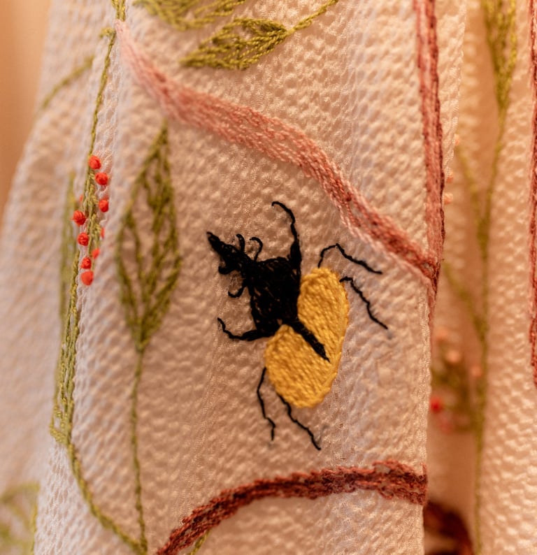 No ateliê, não trabalhamos com reprodução. Cada peça é desenvolvida manualmente, utilizando tecidos naturais, impressão botânica e técnicas de alta costura.